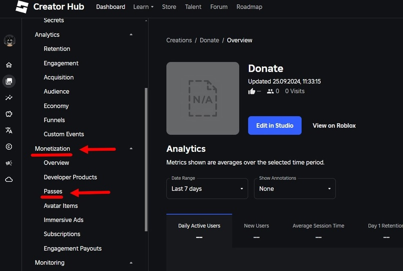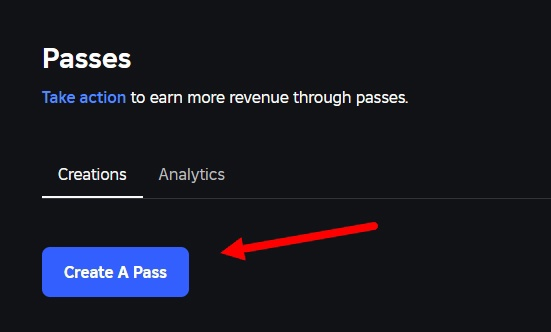 5) В левом меню ищем категорию «Monetization», пункт «Passes» и нажимаем на него.