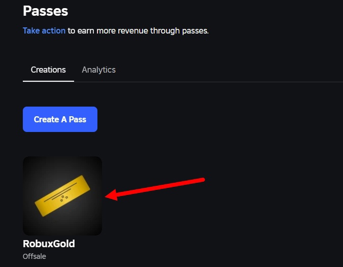 8) Нас перекинет в раздел с нашими Game Passes. Там должен появиться только что созданный нами Pass. Нажимаем на него.