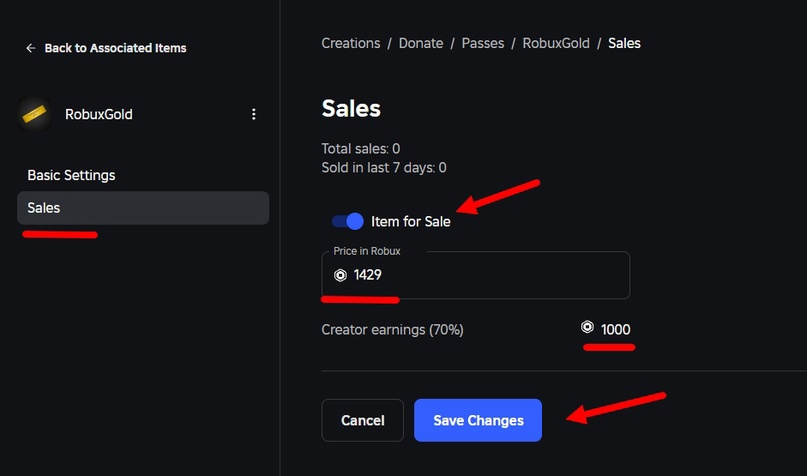 9) В открытом меню нажимаем на раздел «Sales» (слева) и включаем пункт «Item for Sale». Далее вводим цену, которая была указана на сайте в строке «GamePass» при покупке, и нажимаем на кнопку «Save Changes».