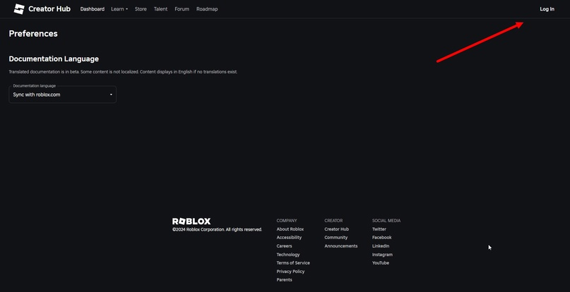 1) Переходим на сайт https://create.roblox.com/ и нажимаем на «Log in» (если данной кнопки нет, значит вы уже авторизованы и можно переходить к 3 пункту).